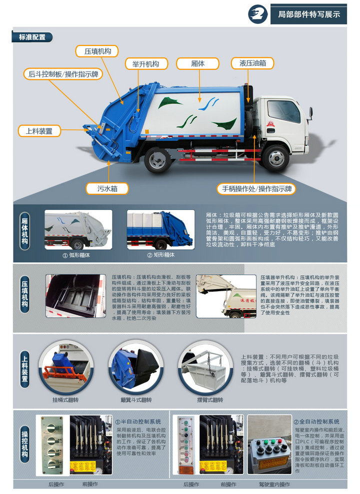 壓縮式垃圾車由密封式垃圾廂、液壓系統(tǒng)、操作系統(tǒng)組成。整車為全密封型,自行壓縮、自行傾倒、壓縮過程中的污水全部進(jìn)入污水廂,解決了垃圾運(yùn)輸過程中的二次污染的問題,關(guān)鍵部件采用進(jìn)口部件,具有壓力大、密封性好、操作方便、安全等優(yōu)點(diǎn)。