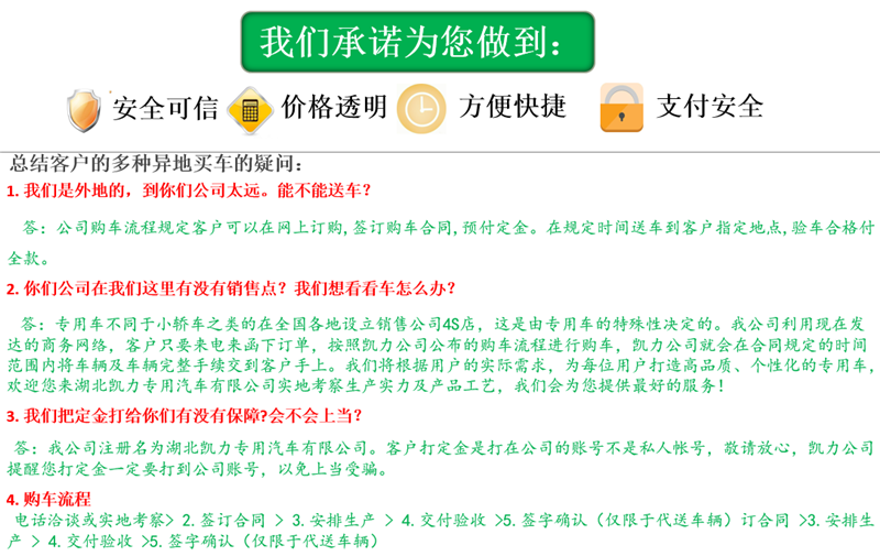 | 2、購車流程: | 1、咨詢洽談(電話洽談或來廠考察洽談) 2、簽訂汽車購銷合同(傳真、郵遞或者來廠簽訂) 3、我廠按時(shí)按質(zhì)生產(chǎn) 4、交付驗(yàn)收 >>點(diǎn)擊查看詳細(xì)內(nèi)容 |